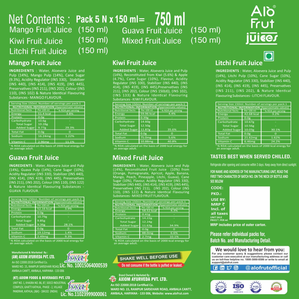 Description : Alofrut Celebration Gift Pack offers a delightful assortment of 5 refreshing fruit juices – Mango, Kiwi, Litchi, Guava, and Mixed Fruit – in 150ml bottles. Perfect for gifting, this premium juice combo brings taste and health together in every sip.Each juice is crafted with fruits and aloe vera chunks, offering a perfect balance of taste and wellness benefits.
